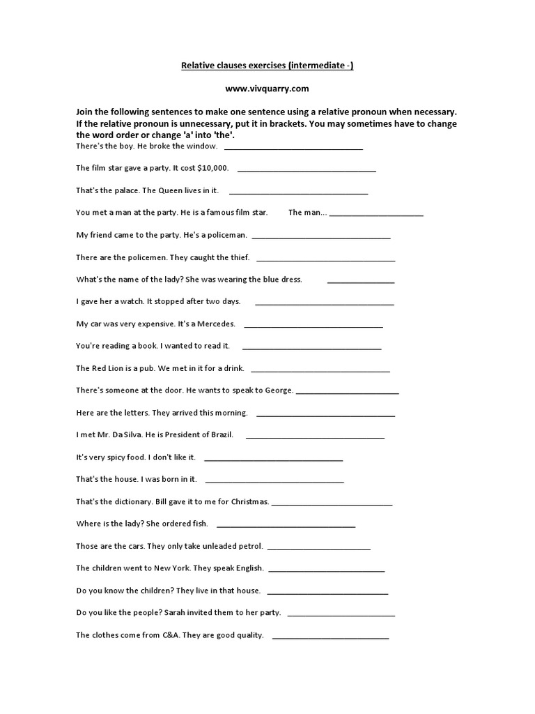 No initial words are given. His wife's got a shop which sells all kinds of bags. With lingolia plus you can access 7 additional exercises about relative clauses, as well as 866 online exercises to improve your english. This … combine the following sentences using a relative pronoun. 1 underline any relative pronouns that can be left out in these sentences. Relative pronouns adjective clauses whose vs of which vs of whom. It wasn't available in the library. No questions relative clauses relative clauses: Relative pronouns are the words that introduce relative clauses. Relative pronouns use the relative pronouns in the box to complete the sentences. Relative 2 exercises to revise defining relative clauses. All relative clauses describe a noun, and they begin with one of these. Today we're going to look at something that's very important for all of you go natural we use relative clauses to to join two sentences or to add information to a sentence.